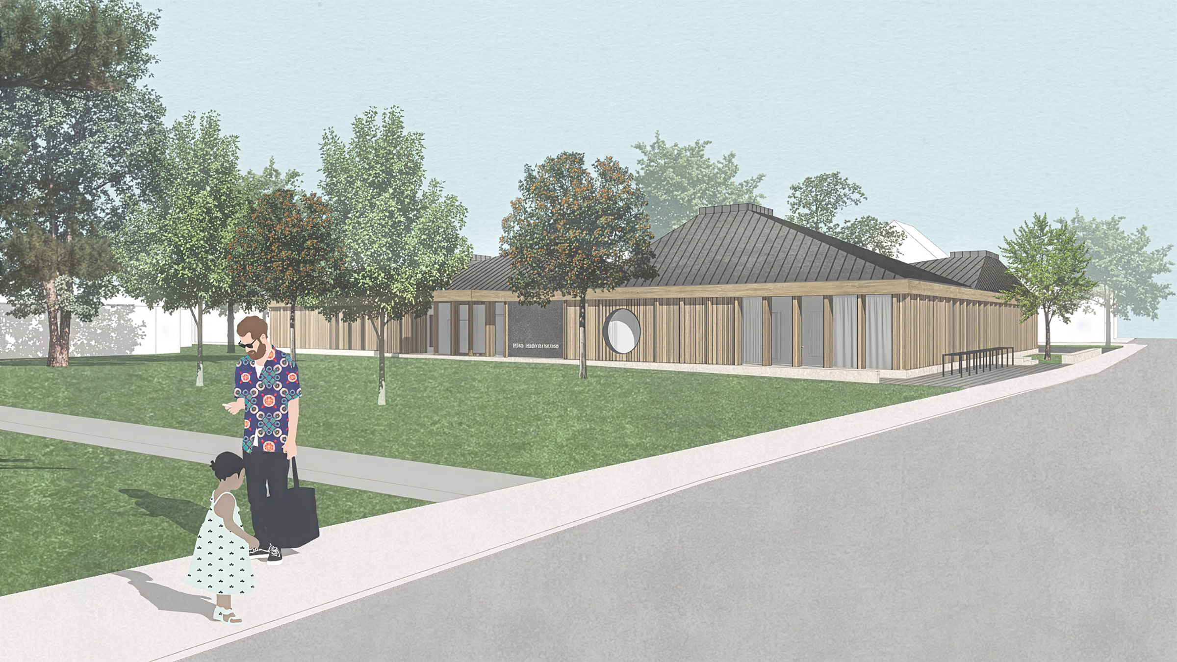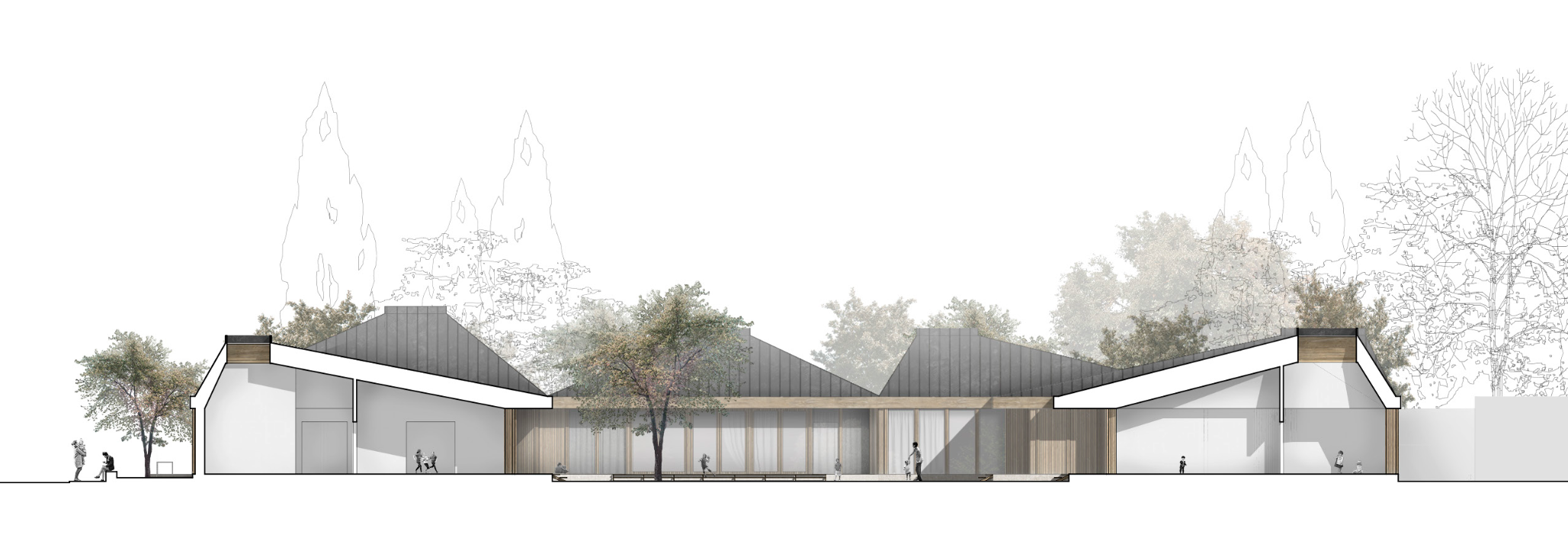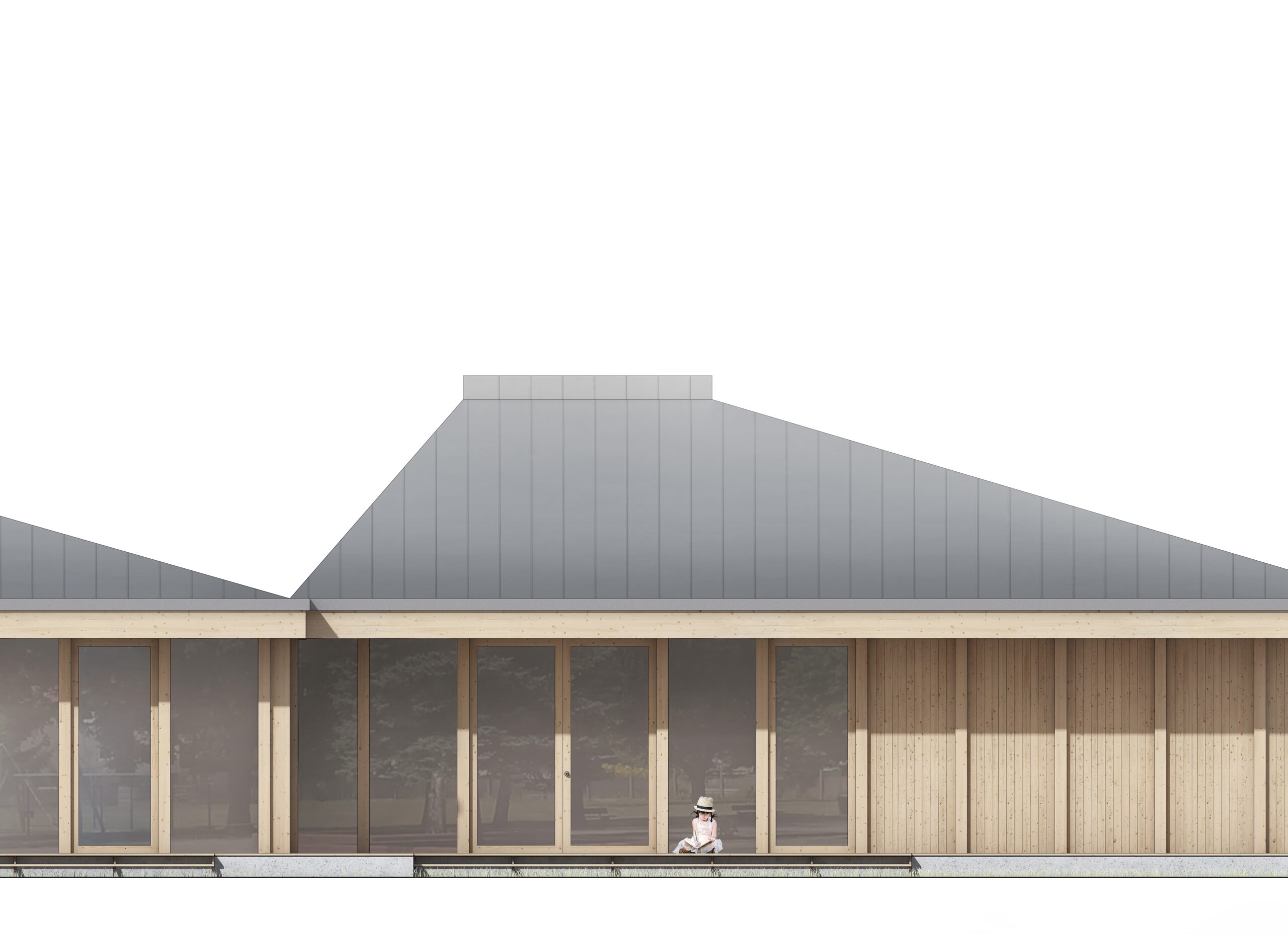 Das eingeschossige Gebäude umschließt in einer u-förmigen Anordnung einen von äußeren Einflüssen geschützten Innenhof. Das Gebäudevolumen wird durch Unterteilungen in einzelne Häuser auf einen kindgerechten Maßstab geführt. Die kleinteilige Struktur fügt sich in den vorhandenen Städtebau ein und wird zu einem „Dorf in der Stadt“.