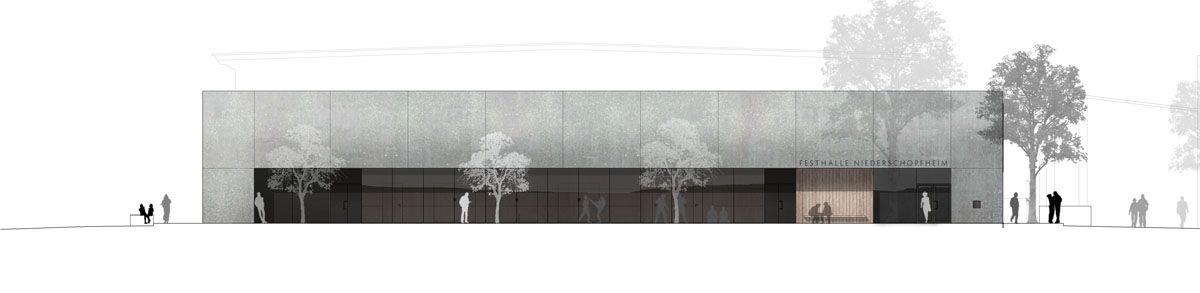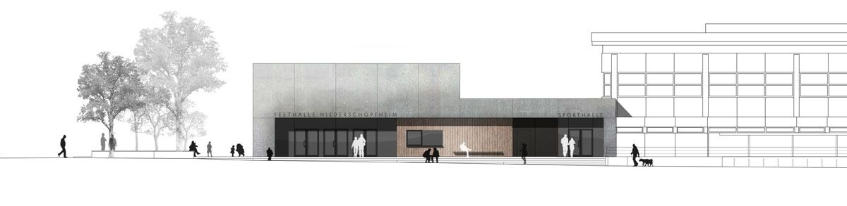 Die neue Mehrzweckhalle schließt als Erweiterungsbau an die bestehende Hohberghalle an. Ein gemeinsamer neuer Eingangsbereich verbindet alle Gebäudeteile miteinander. Die Mehrzweckhalle öffnet sich mit einer bodentiefen Verglasung zum neu gestalteten Freiraum hin.