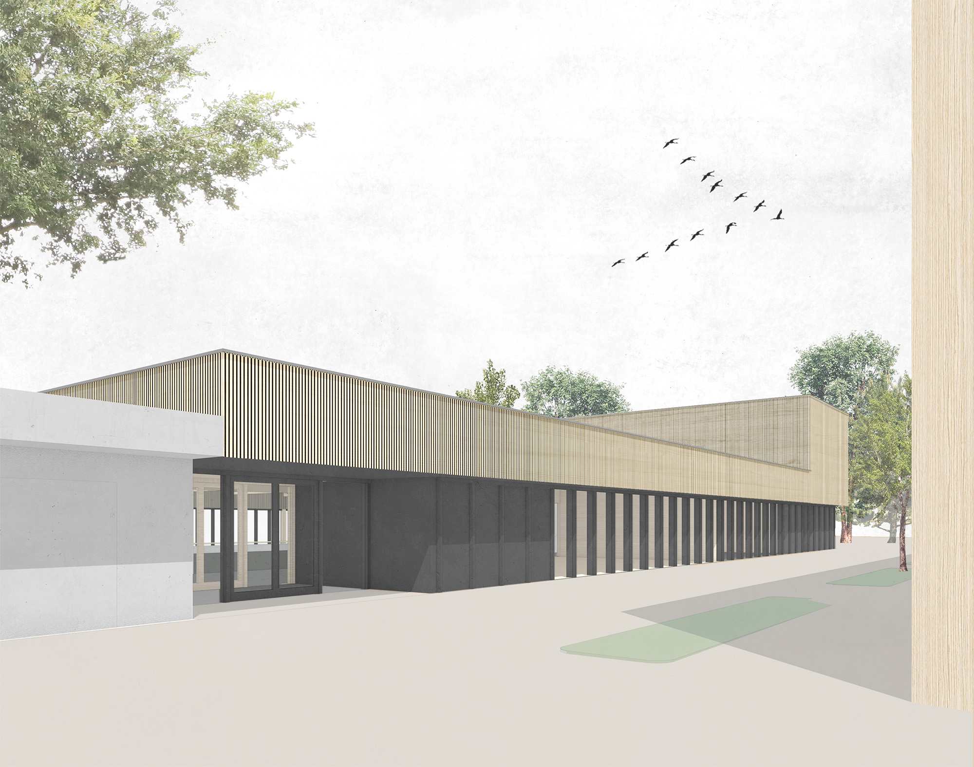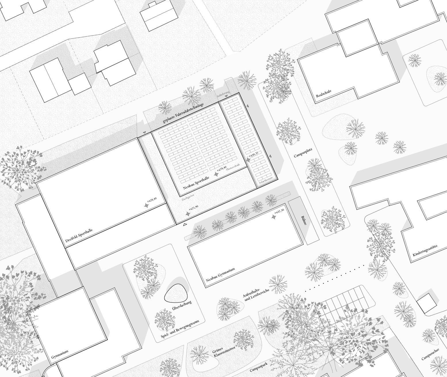 Die neue 2-Feld Sporthalle am Bildungszentrum Döchtbühl erweitert die bestehende Dreifeldhalle und entwickelt deren bauliche Logik weiter. Neben der Sporthalle beherbergt der Neubau eine Jugendmusikschule sowie ein Stadtarchiv. Diese sind in einem zweigeschossigen Riegel zum Campusplatz hin untergebracht, der einen städtebaulich markanten neuen Hochpunkt bildet.