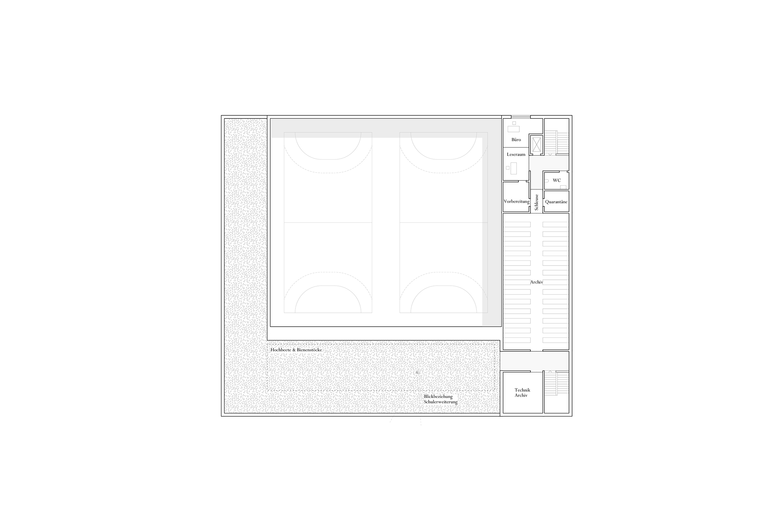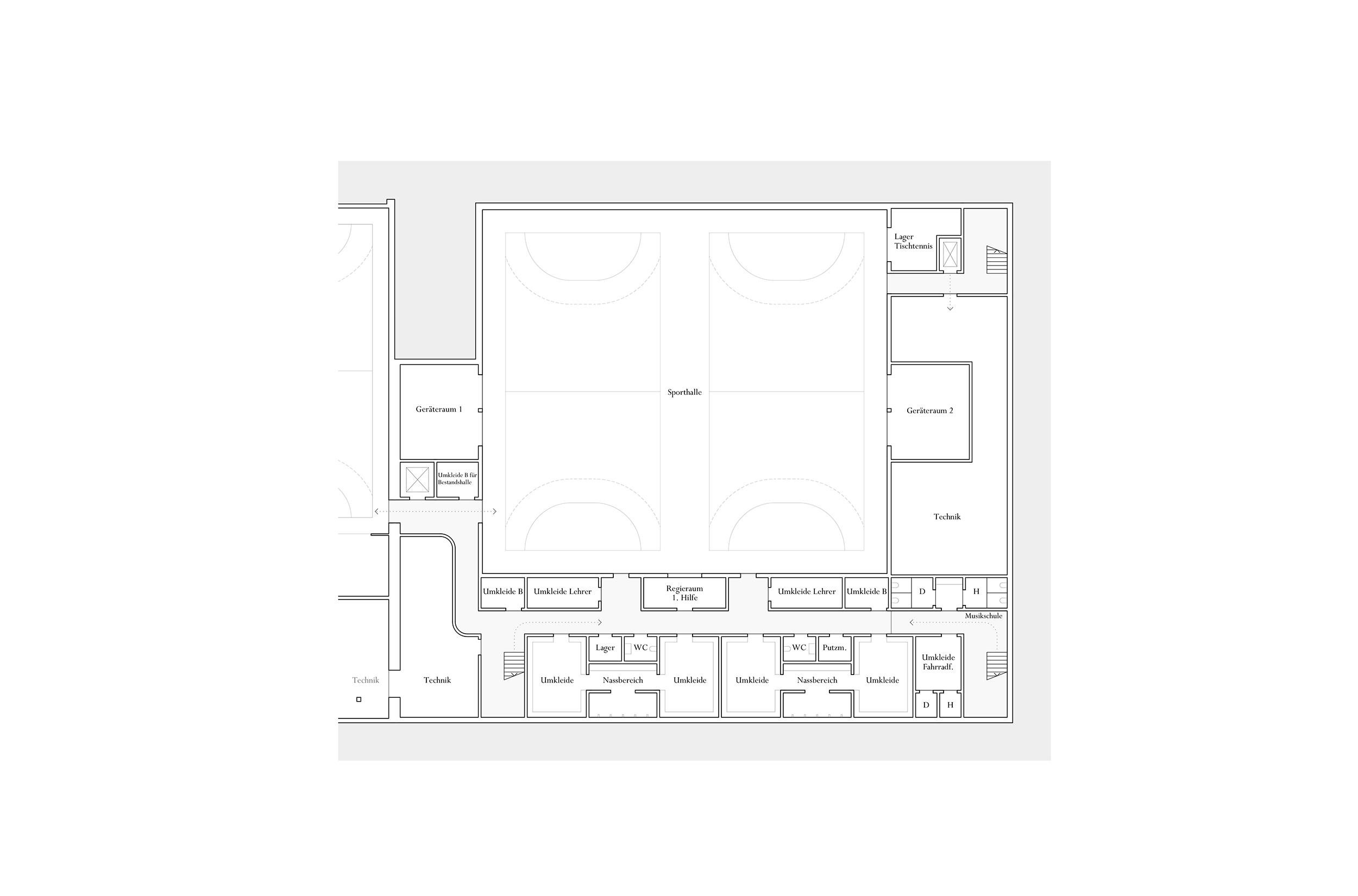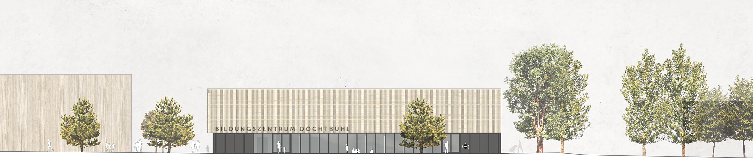 Die neue 2-Feld Sporthalle am Bildungszentrum Döchtbühl erweitert die bestehende Dreifeldhalle und entwickelt deren bauliche Logik weiter. Neben der Sporthalle beherbergt der Neubau eine Jugendmusikschule sowie ein Stadtarchiv. Diese sind in einem zweigeschossigen Riegel zum Campusplatz hin untergebracht, der einen städtebaulich markanten neuen Hochpunkt bildet.