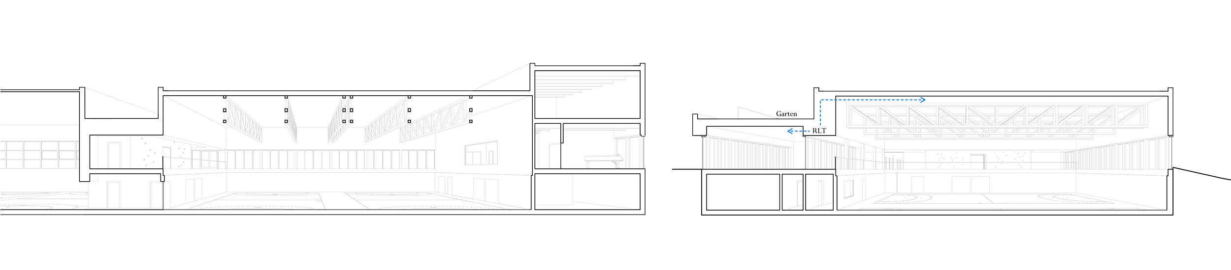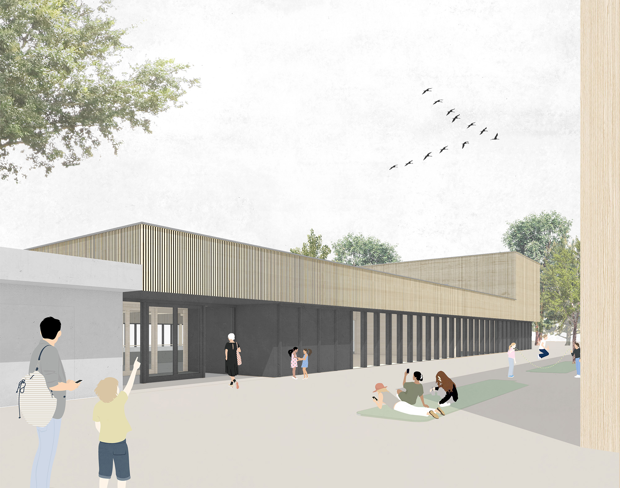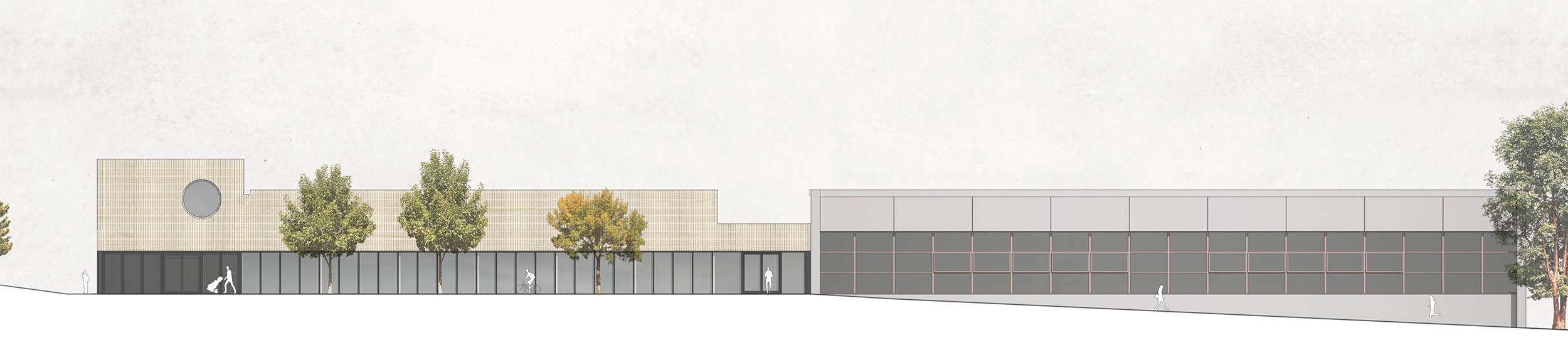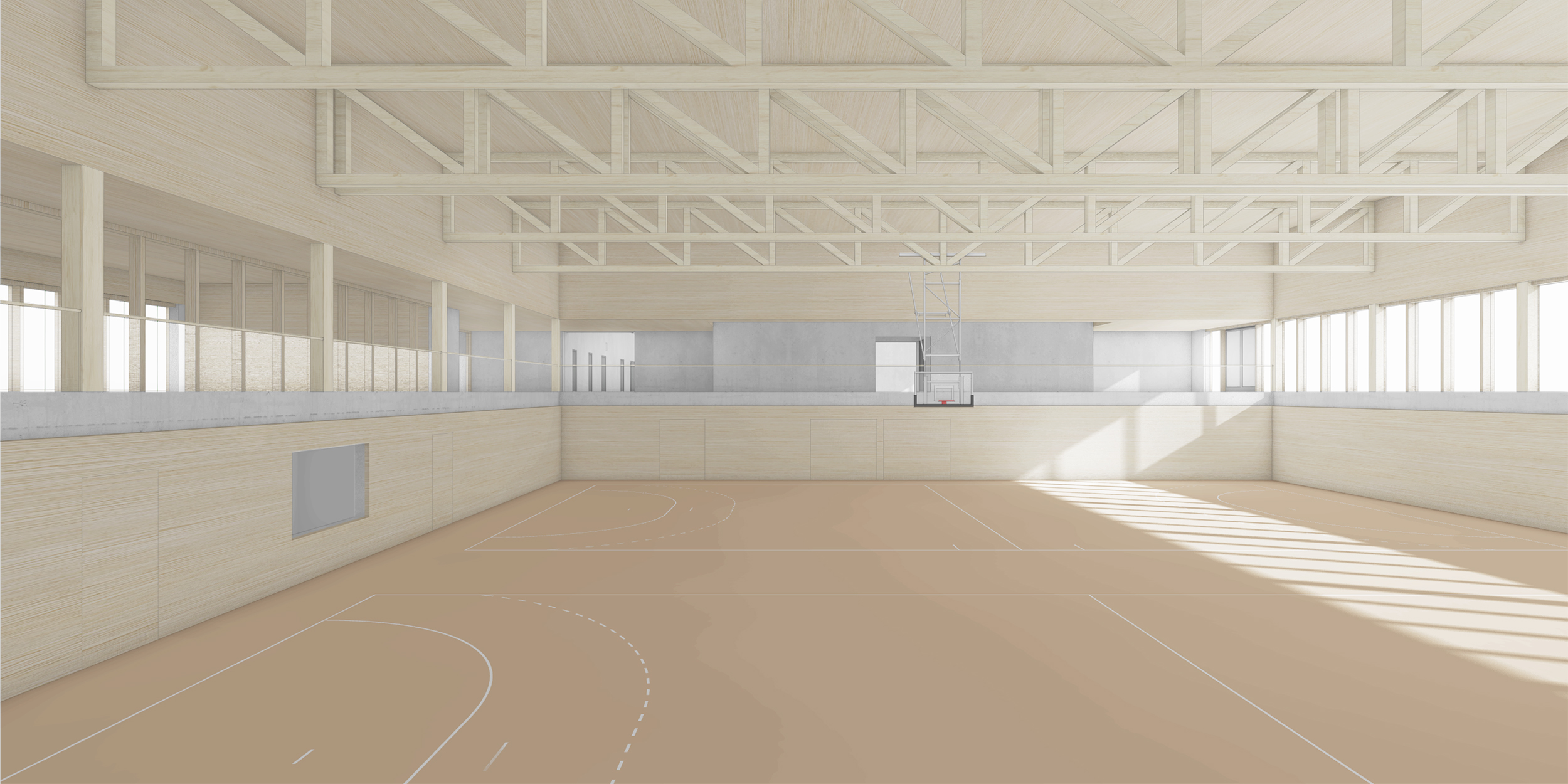 Die neue 2-Feld Sporthalle am Bildungszentrum Döchtbühl erweitert die bestehende Dreifeldhalle und entwickelt deren bauliche Logik weiter. Neben der Sporthalle beherbergt der Neubau eine Jugendmusikschule sowie ein Stadtarchiv. Diese sind in einem zweigeschossigen Riegel zum Campusplatz hin untergebracht, der einen städtebaulich markanten neuen Hochpunkt bildet.