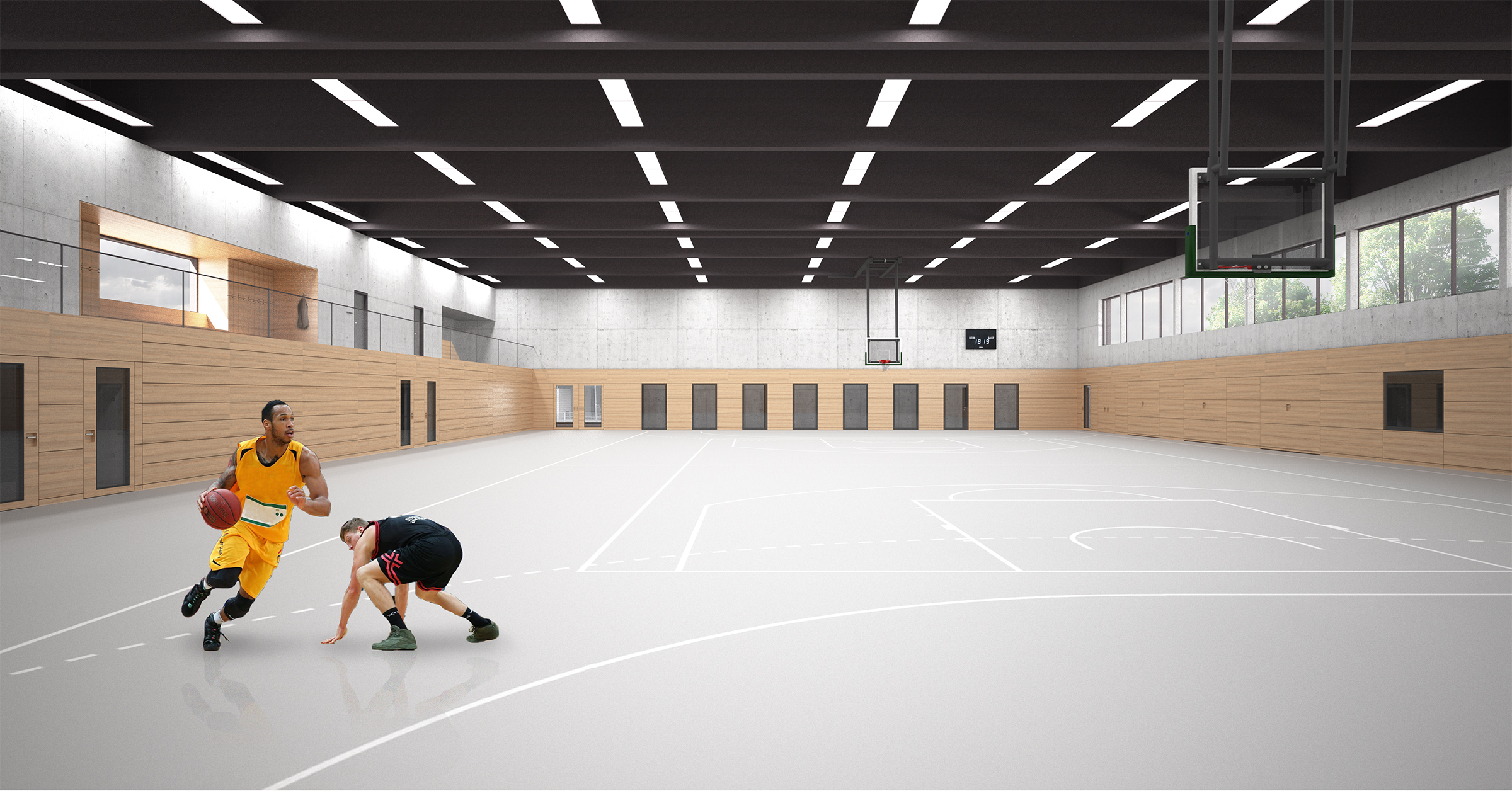 Die neue 3-Feld-Sporthalle des Kasseler Sportzentrums vermittelt zwischen der bestehenden Großsporthalle und dem Auepark. Von der Parklandschaft aus sichtbar, prägt die markante Halle das umliegende Parkensemble. Das Gebäude orientiert sich an den Fluchten der Großsporthalle, zwischen den gegenüberliegenden Eingängen entsteht ein gemeinsamer Vorplatz mit Haupteingang für Sportler und Besucher.